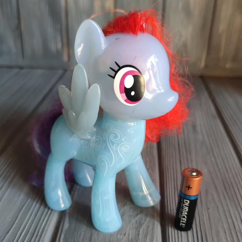 фигурка пони Hasbro есть немного потертости крыло было отдирировано, нажаль, приклеили немного не ровно, можно переклеить, или играть так Иногда включается лампочка, иногда нет. в комплект не входять батарейки