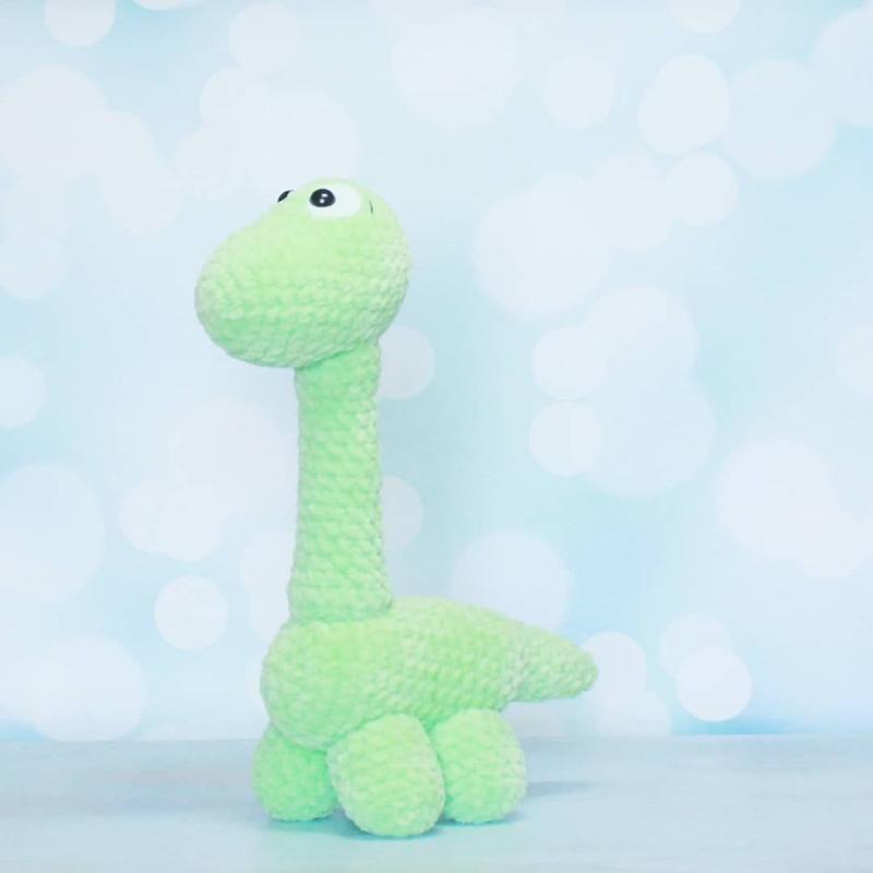 Улюбленець дітлахів динозавр. Іграшка зв'язана з неймовірно м'якою плюшевої пряжі, наповнювач холлофайбер. Всі деталі міцно пришиті. Висота іграшки близько 27 см. Кольори можемо підібрати індивідуально. Термін виготовлення може бути змінений в залежності від наявності пряжі та фурнітури