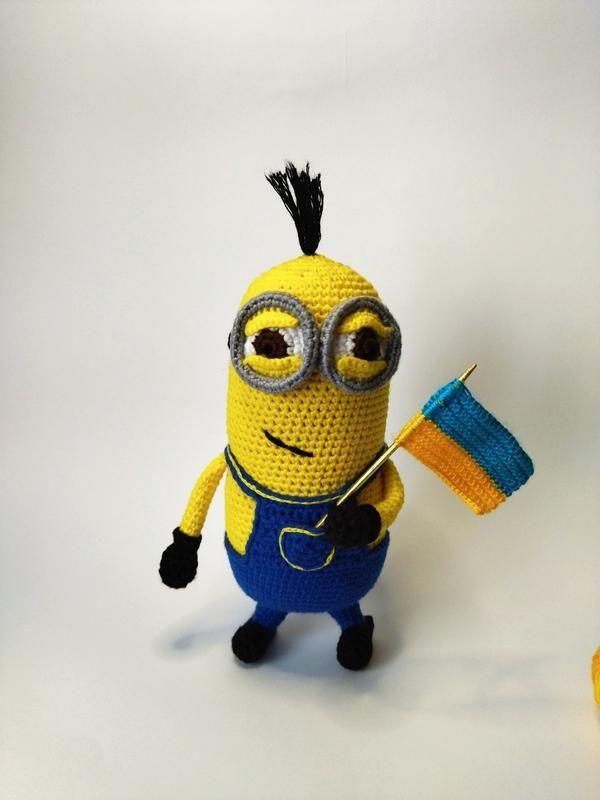 Все поддерживают Украину, даже миньон Кевин верит в победу нашей страны. Рост красавца (без учета чубчика) 20 см, в ширину 8,5 см, без ручек (диаметр) 7 см. Связан в технике амигуруми из пряжи YarnArt Джинс.