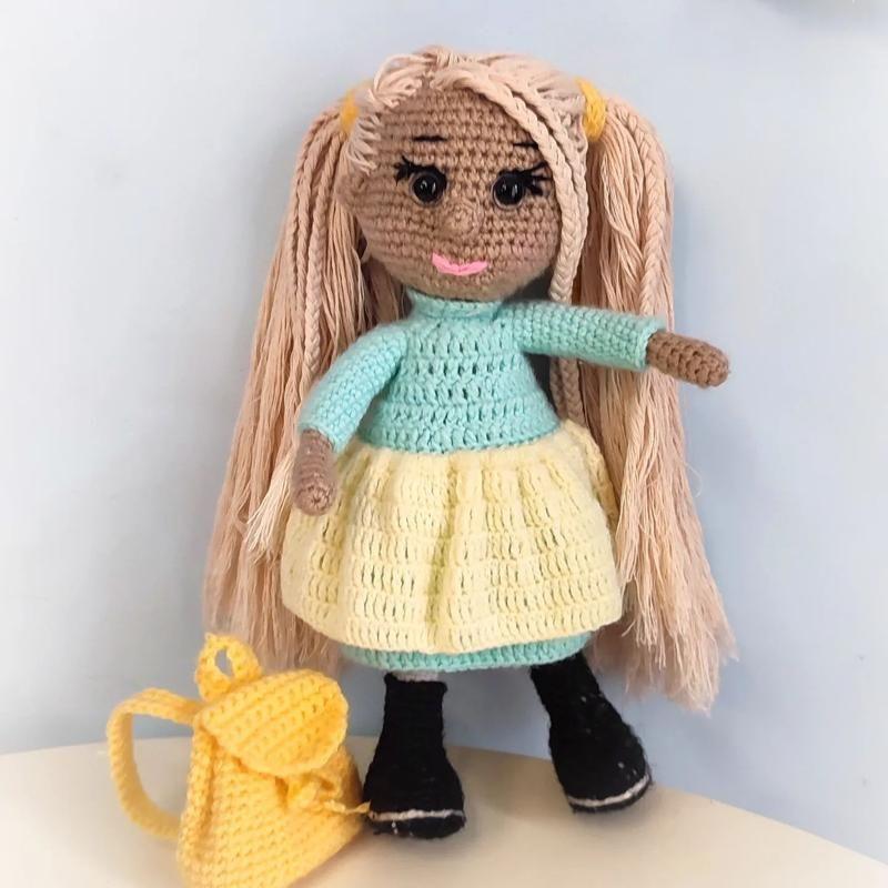 Ця довговолоса красуня ручної роботи зв'язана в техніці амігурумі з бавовняної пряжі. Наповнювач гіпоалергенний холлофайбер. Очі на безпечному кріпленні. Ручки,ніжки гнуться. Одяг знімається. В комплекті одне плаття, білизна, рюкзак , стрічка для волосся . Висота ляльки 29 см . Довжина волосся 29 см. За бажанням можливе виготовлення змінного одягу. Ціна 650 грн. Для замовлення звертайтесь у приватні повідомлення . #подарунок