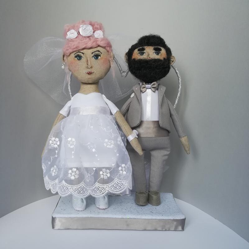 Одна из первых моих работ, за символическую плату Кукольная парочка молодожёнов, станет оригинальным подарком на память, молодым или их родителям. Так же куклы могут быть частью оформления праздничного стола. Куколки стоят на подставке. Высота 25 см, сшиты из льна. Ручная работа.