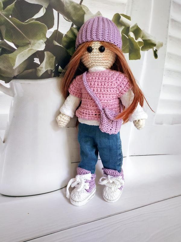 Кукла связана крючком из хлопковой пряжи , размер 28 см , с гардеробом