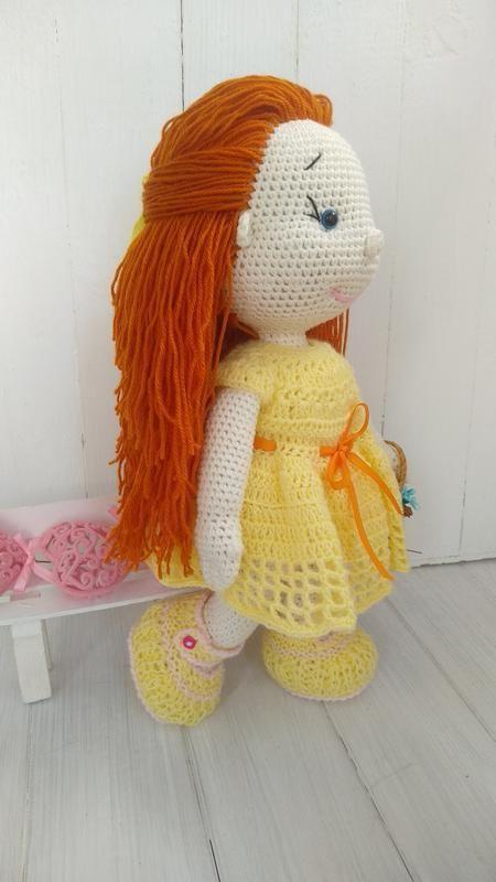 Каркасная кукла из хлопчатобумажной нити,подвижные ручки и голова. Одежда-платье на застежку,босоножки на пуговицы,все снимается.Волосы можно расчесывать и делать прическу.Наповненна холофайбером.Рост 40см. Товар под заказ