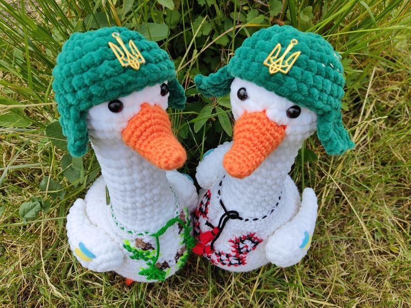 Гуси вязанные крючком из плюшевой пряжи, одеты в вышитые рубашки и каски. Одежда снимается Рост 35см