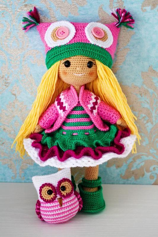 Кукла в красивом платьице вязаная крючком с игрушкой-совой. подарок дочке. экоигрушка.