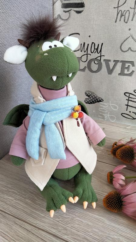 Інтер'єрні іграшки - це любов назавжди. Ми створюємо іграшки вже багато років. Кожна іграшка зроблена власноруч і з великою любов'ю, тому стане прекрасним доповненням вашого інтер'єру, даруя радість та добру енергетику. Чудовий подарунок до будь-якого свята, ми впевнені здивує і малечу і дорослих. Дракончик зроблен із флісу, наповнювач синтепон, трикотаж, натуральне хутро, полімерна глина. Зріст 30 см