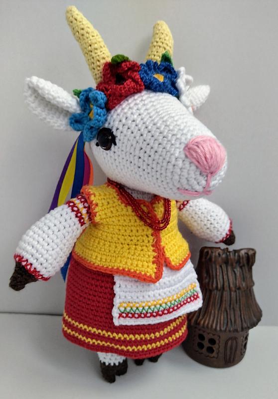 Коза дереза створена по мотивам. української народної казки.Іграшка в'язана з напівбавовняних ниточок.Наповнювач гіпоалергений холофайбер. Очі на безпечному кріпленні.Віночок знімається. Вишивка ручної роботи. Висота іграшки 25 см.