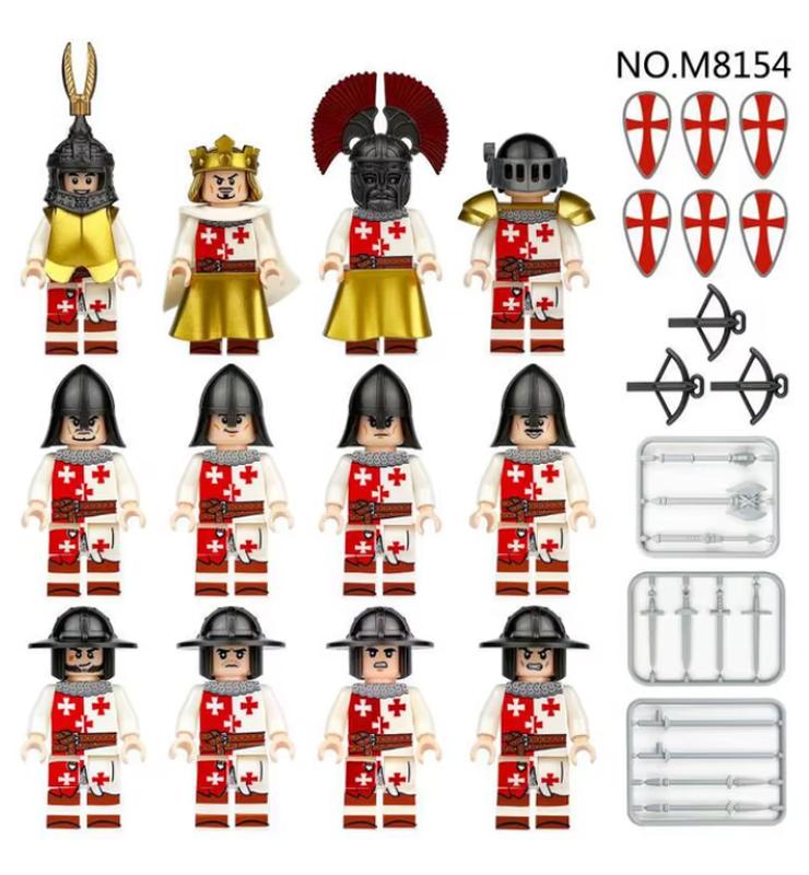 Фигурки поставляются в упаковке без коробки В набор входят 12 рыцарей + оружие. Все фигурки новые, запечатанные в отдельные пакетики. Изготовлены из качественных материалов.