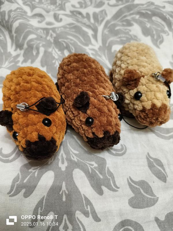 При виборі іграшки пишемо в особисті в чат - КОЛІР, щоб зрозуміло яку ви хочете. Розмір 9-10 см. Плюшеві і дуже няшні брелоки капібара. Брелок можна кріпити всюди завдяки зручному карабіну. Як це зробити: 1) Зняти з іграшки брелок 2) Просунути у те місце куди хочете закріпити брелок, зав'язати петелькою 3) Вдягти карабін на іграшку. Легко прати (замочити у воді 40°, трошки пожмакати, про полоскати у чистій воді, поки не вийде вся мильна вода). Кількість іграшок можна міняти під замовлення.