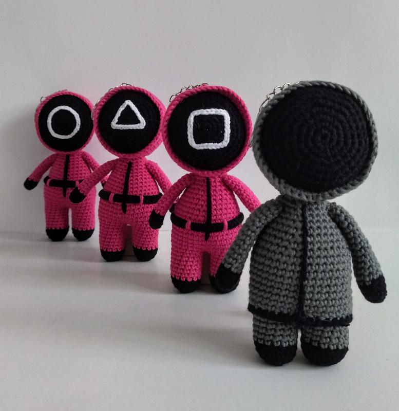 Іграшки- брелоки за мотивами серіалу Гра в кальмара.Ниточки напівбавовна.Наповнювач гіпоалергений холофайбер.Брелочки можна почепити на сумочку чи рюкзак так улюблені герої будуть завжди з вами. Зверніть увагу Ціна вказана за 1 іграшку.