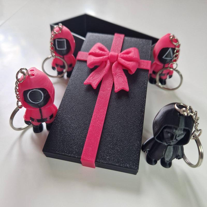 Уникальный набор для фанатов "Гри в кальмара"! Погрузитесь в мир игры Squid Game с этим невероятным коллекционным набором! В комплект входят брелоки-солдаты с различными символами (Кругший работник, Квадратный менеджер, Треугольный солдат) и загадочный Фронтмен в маске, изготовленные методом 3D-печати из экологичного PLA-пластика. Вся коллекция стильно упакована в тематическую коробку в виде трусы с культовым красным бантиком – точной копией той, что появлялась в сериале. Это не только крутой аксессуар, но и идеальный подарок для ценителей напряженных сюжетов и стильных сувениров!