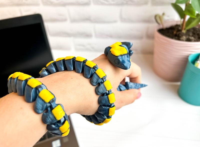 Гибкая 3D-змея – 79,5 см – сине-желто-черная Продается яркая и необычная игрушка – гибкая змея, напечатанная на 3D принтере. Ее длина – 79,5 см, изготовлена из прочного PLA-пластика. Имеет эффектное сочетание цветов: синий, желтый и черный. 🐍 Полностью гибкая - легко изгибается и извивается, как настоящая змея. 🎨 Эстетичный и современный дизайн. 🖐 Вручную изготовлено из качественного пластика на 3D-принтере. 🎁 Отличный подарок для детей, коллекционеров или на память. 🧠 Также подходит в качестве антистресс-игрушки для работы или учебы.