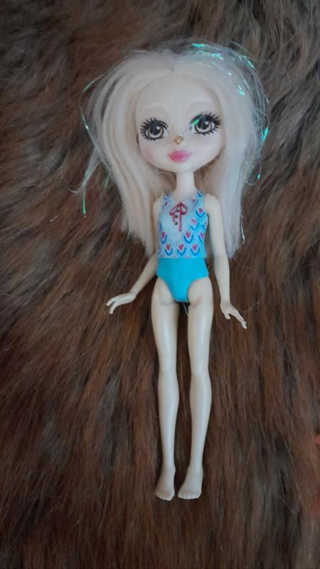 На изображении кукла Enchantimals, из коллекции Sleepover Night Owls. Эти куклы известны своими связями с животными. Кукла имеет белые волосы и одета в купальник голубого цвета с узором.