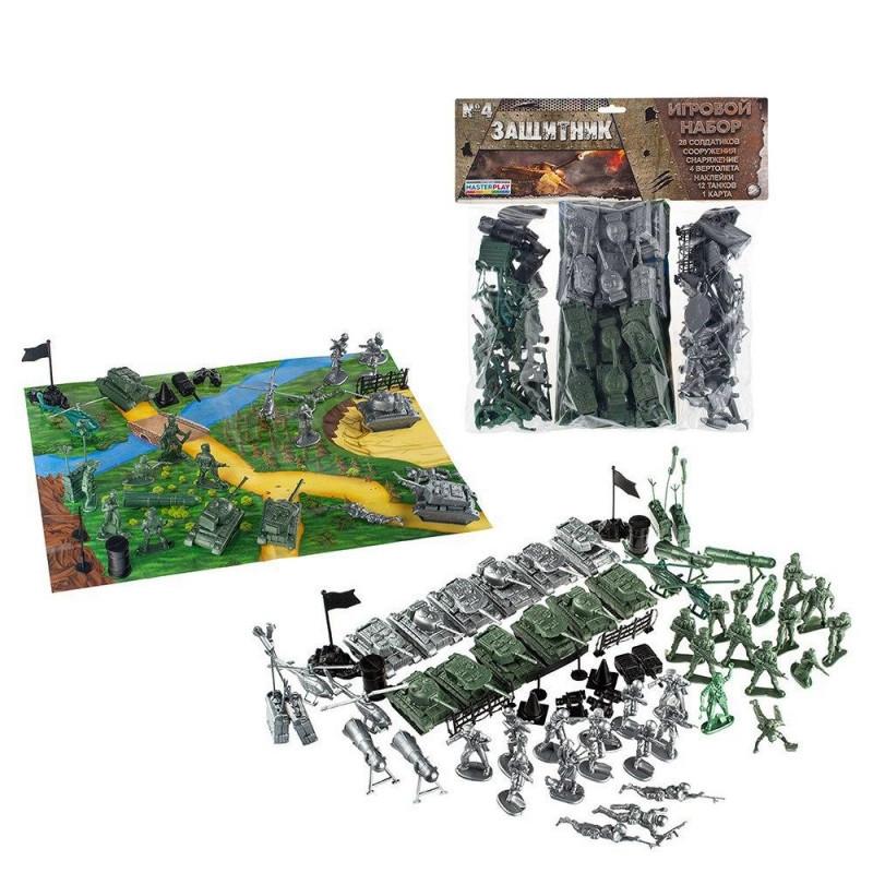 Солдатики "Защитник" No4 - этот набор будет замечательным подарком для любого мальчишки! Большой комплект, состоящий из армии обученных и прекрасно экипированных солдат, 12 мощных танков, вертолетов, строений, различного спец снаряжения и карты позволит провести блестящую военную кампанию, не оставив ни малейшего шанса на победу противнику. Фигурки солдат в динамичных позах выполнены с большой реалистичностью и передают весь накал и драматизм настоящего сражения, а военная техника изготовлена с максимальным вниманием к деталям. Набор "Защитник" пригодится ребенку для домашних игр, но его можно смело использовать и в уличных баталиях с друзьями. Элементы набора изготовлены из пластика высокого качества, безопасного для здоровья ребенка. Набор рекомендован для детей от 3-х лет. В комплекте: солдатики (28 дет.), вертолет (4 дет.), танк (12 дет.), карта, сооружения, снаряжение. Упаковка: пакет ПВХ. Товар сертифицирован и прошел все лабораторные испытания.