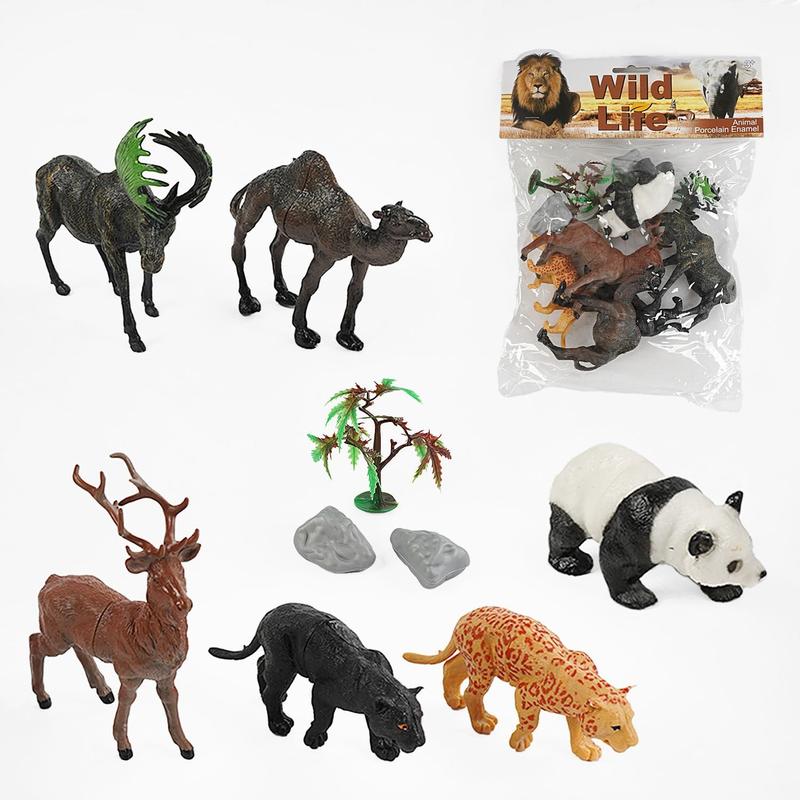 Набір фігурок Тварини дикі (C 963-3), 6 диких тварин, аксесуари, в пакеті. Створюй вдома власний міні-зоопарк або вирушай на сафарі! Фігурки у вигляді тварин тобі в цьому допоможуть. Благородний олень та красень-лось з величезними рогами, поважний верблюд та потішна панда, граційні пантера та гепард - всі вони готові до захоплюючих подорожей! Фігурки виготовлені з міцного пластику та мають реалістичний вигляд. Крім тваринок в наборі є два іграшкові камені та дерево. Особливості: - 6 диких тварин (лось, олень, верблюд, панда, пантера, гепард); - виготовлені з міцного пластику; - фігурки тваринок мають реалістичний вигляд; - аксесуари (одне дерево та камені, 2 шт). Розмір упаковки: 23.5 см × 4 см × 30 см Упаковка: Пакет Вік: від 3 років