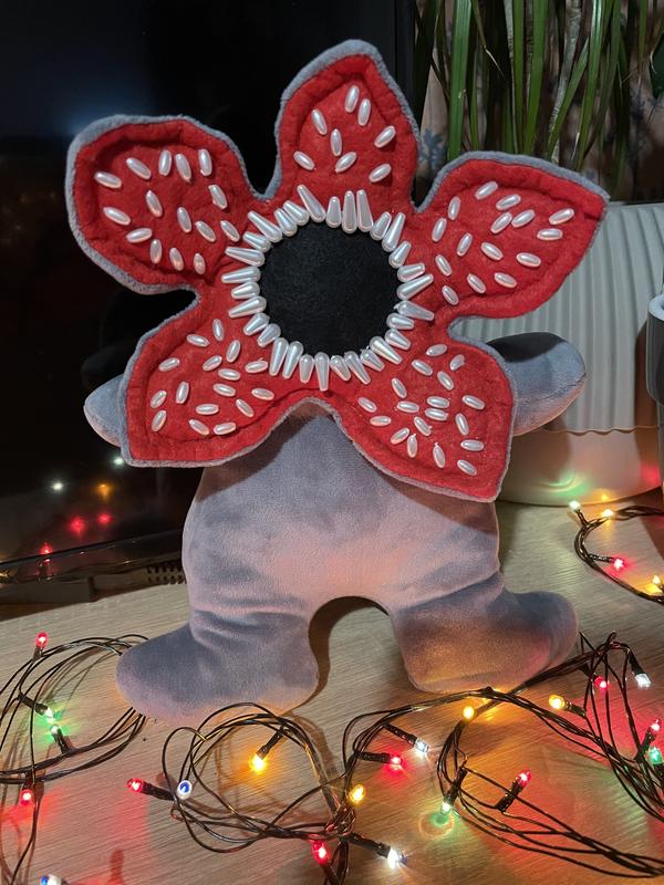 Мʼяка інтерʼєрна іграшка у вигляді демогоргона з відомого серіалу «Дивні дива» . Виконана з тканини велюр спорт , лицьова частина монстра виготовлена з фетру , пелюстки згинаються можна надати їм бажаної форми . Зуби це продовгуваті бусини різного розміру якісно пришиті до основи . Додавши кольорові ліхтарики , можна створити неповторний вайб відомого серіалу . Розміри 25*20
