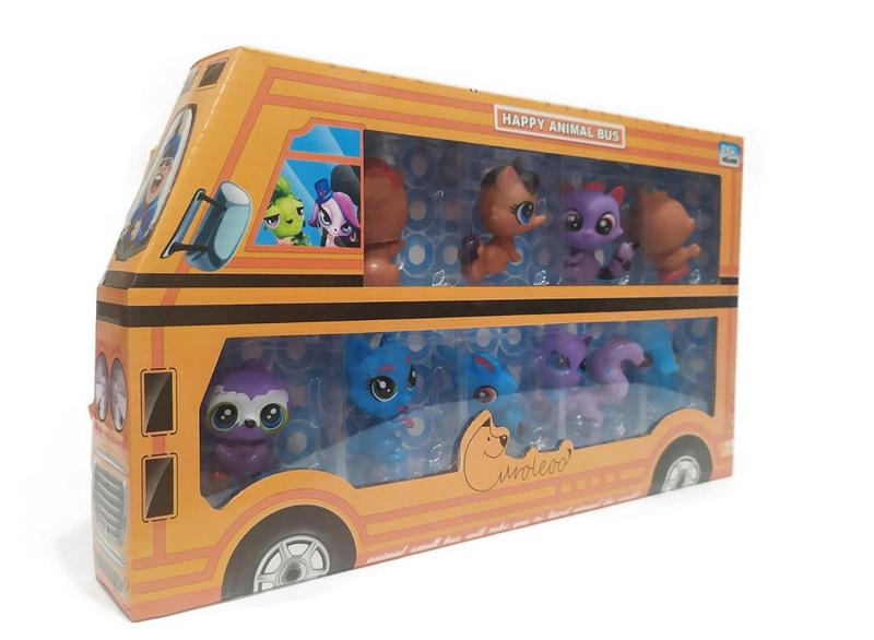 Интересный картонный автобус с девятью разными пассажирами -- зверьками всех мастей пет шопов. В наборе Вам попадётся: - котик; - уточка; - мышка; - хорёк; - совенок и другие