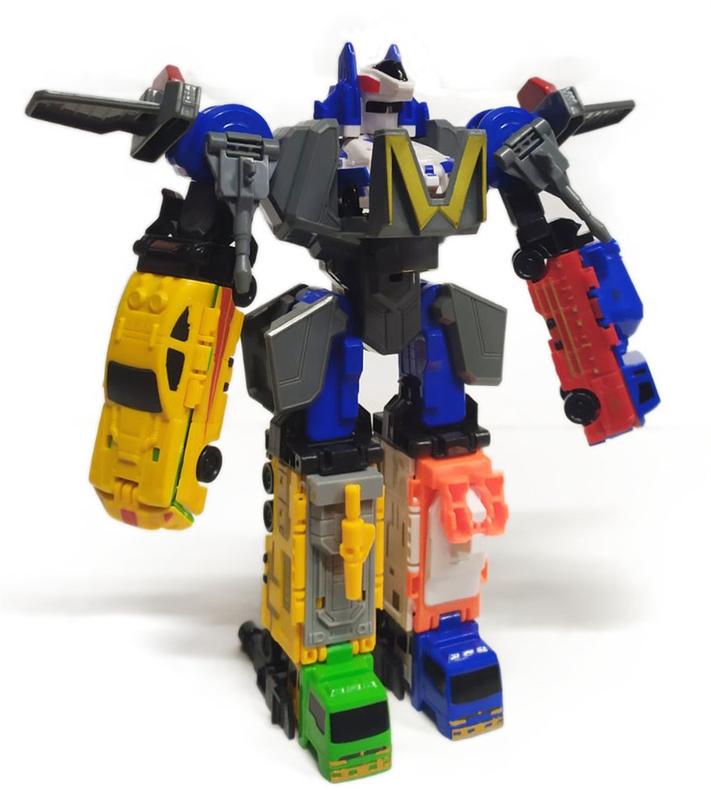Робот состоит из шести элементов: 1. Большой звездолёт как туловище. 2. Две легкие машинки. 3. Бетономешалка -- вторая рука 4. Две ноги-фуры. Каждый транспорт имеет два внешних вида.