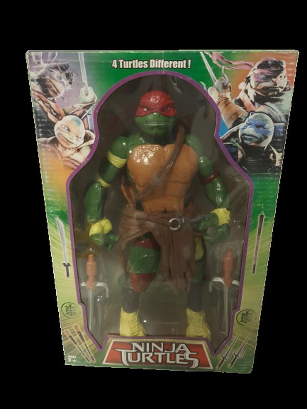 Це щось неймовірне! Велика фігурка-іграшка Черепашка ніндзя з однойменного кінофільму. Висота іграшки 27 см! Звичайності рухаються у всіх суглобах! (пензлі, лікті, плечі, коліна, стопи, стегно) Якісний пластик, міцний і важкий. У наборі зброя та поясна пов'язка, що знімається з пояса. Розмір коробки: 32*21 см ( Чудовий подарунковий варіант)