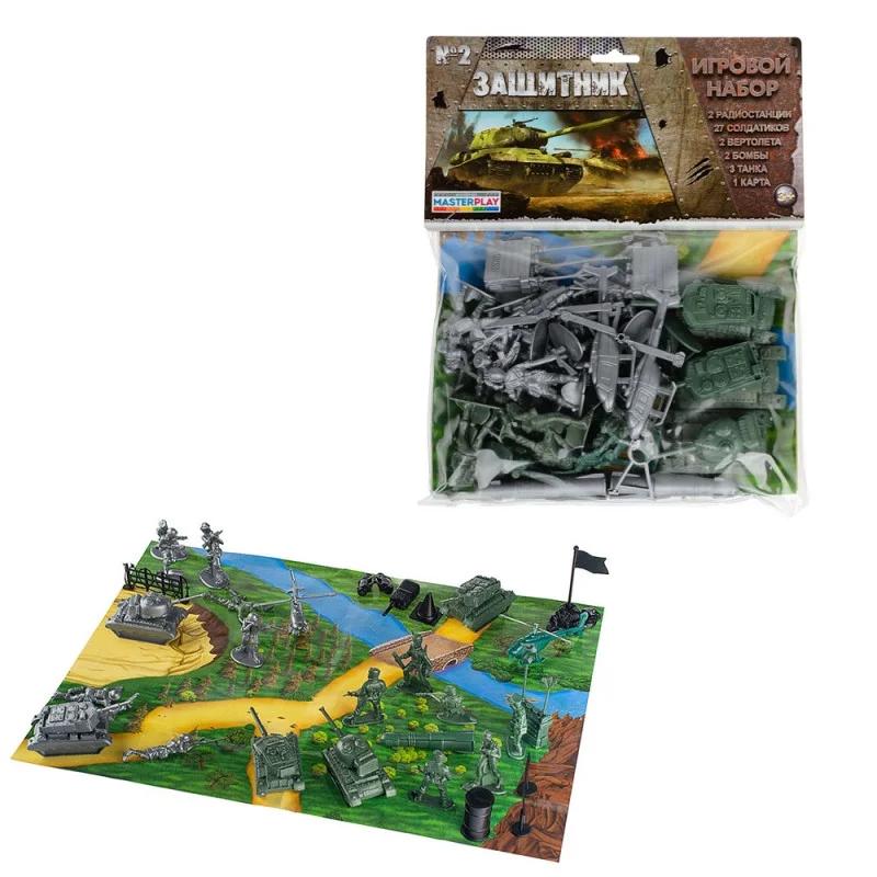 Солдатики "Защитник" №2 - игровой набор, состоящий из бравых солдат и целого арсенала военного снаряжения и военной техники не оставит противнику ни малейшего шанса! Фигурки людей в динамичных позах, танки, вертолеты и радиостанции выполнены максимально реалистично и передают все детали экипировки и оснащения. Набор "Защитник" пригодится ребенку для домашних игр, но его можно смело использовать и в уличных баталиях с друзьями. Элементы набора изготовлены из пластика высокого качества, безопасного для здоровья ребенка. Набор рекомендован для детей от 3-х лет. В комплекте: солдатики (27 дет.), радиостаниция (2 дет.), вертолет (2 дет.), танк (3 дет.), бомба (2 дет.), карта Упаковка: пакет ПВХ. Товар сертифицирован и прошел все лабораторные испытания.