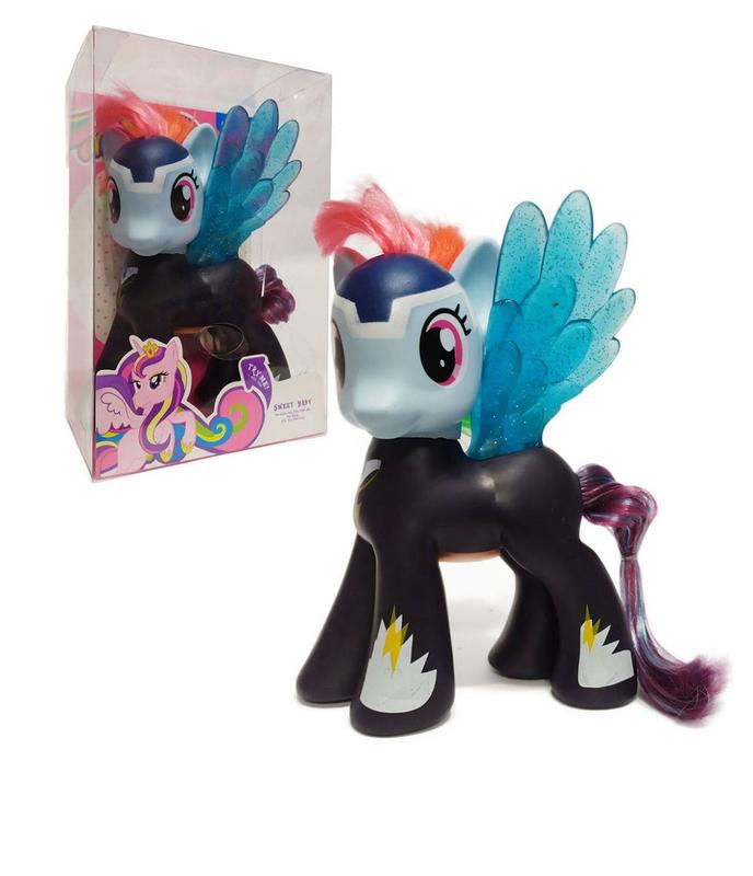 Черная резиновая пони единорог с прозрачными крылышками. При нажатии на кнопку, которая находится на животе у лошадки, светятся крылья и воспроизводятся звуки. Размер игрушки: 15 см