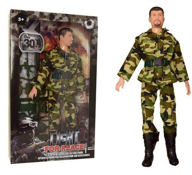 Кукла в виде военного, с набор необходимого снаряжения: автоматы, гранаты, бинокль, фляга и многое другое. У солдата подвижные руки, ноги и голова. Одет в камуфляжный костюм. Упаковка: Коробка Цвет: Зелено-бежевый Вес в упаковке: 315 г Габариты в упаковке: 33 x 19,5 x 5,5 см Габариты без упаковки: 30 x 14 x 3 см Cтрана производитель: Китай Материал: Пластик Комплектация: Солдат, оружие