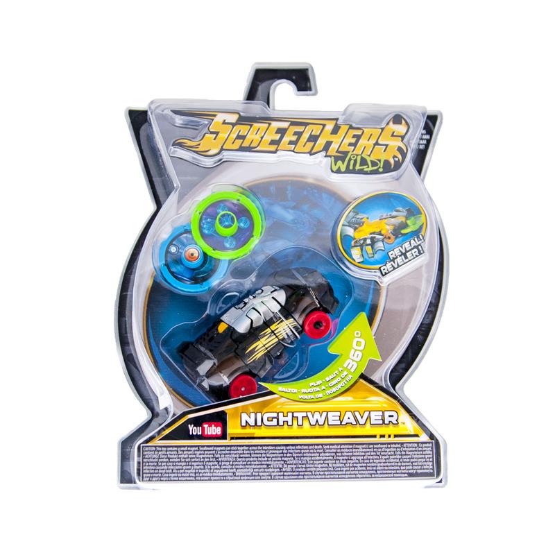 Машинка-трансформер SCREECHERS WILD!, упаковка - картонный планшет с блистером. В комплекте: 1 машинка, 2 диска. Особенности: машина умеет выполнять сальто на 360 градусов и трансформируется в дикого зверя прямо в воздухе. Необходимо запустить авто, направляя его на диск, или наоборот - запустить диск в машинку, и она при столкновении совершит переворот в воздухе и превратится в зверя. Чтобы трансформировать зверя назад, необходимо вытянуть диск и закрепить пружину внизу машины. Материалы: пластик, металл, магнит. Размеры машинки 8*3*4 см.