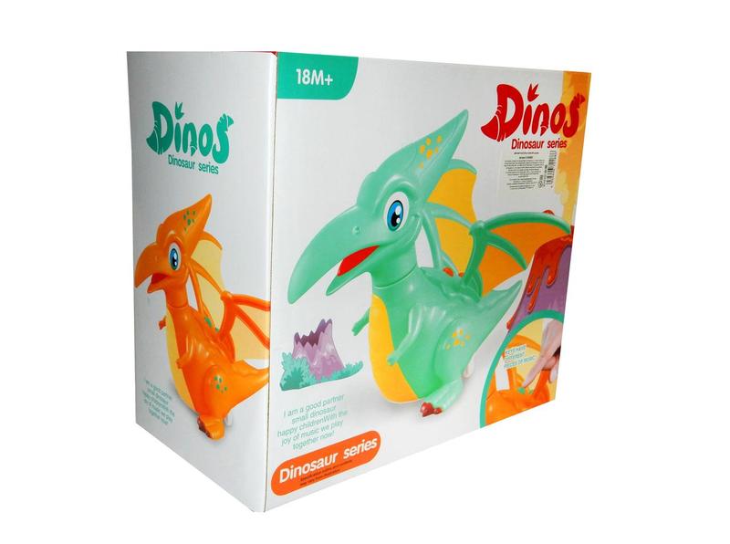 Динозавр музичний 2807. Розробляє від 3 батарейок АА.Розмір упаковки: 26*23*14,5 см.