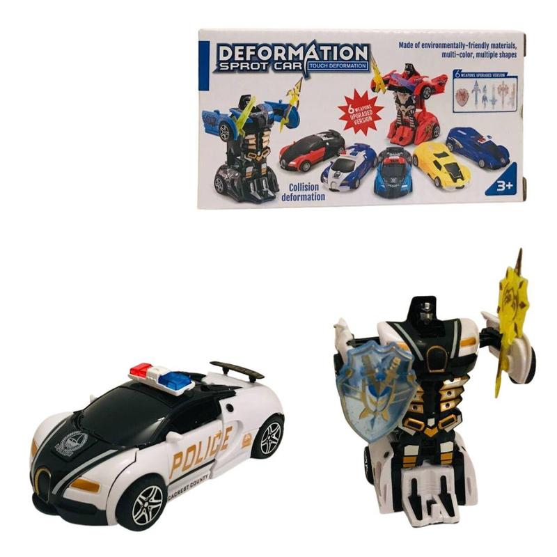 Трансформер машина представлена в 4-х видах. Игрушка оснащена инерционным механизмом, в комплекте с машинкой идет два вида оружия.