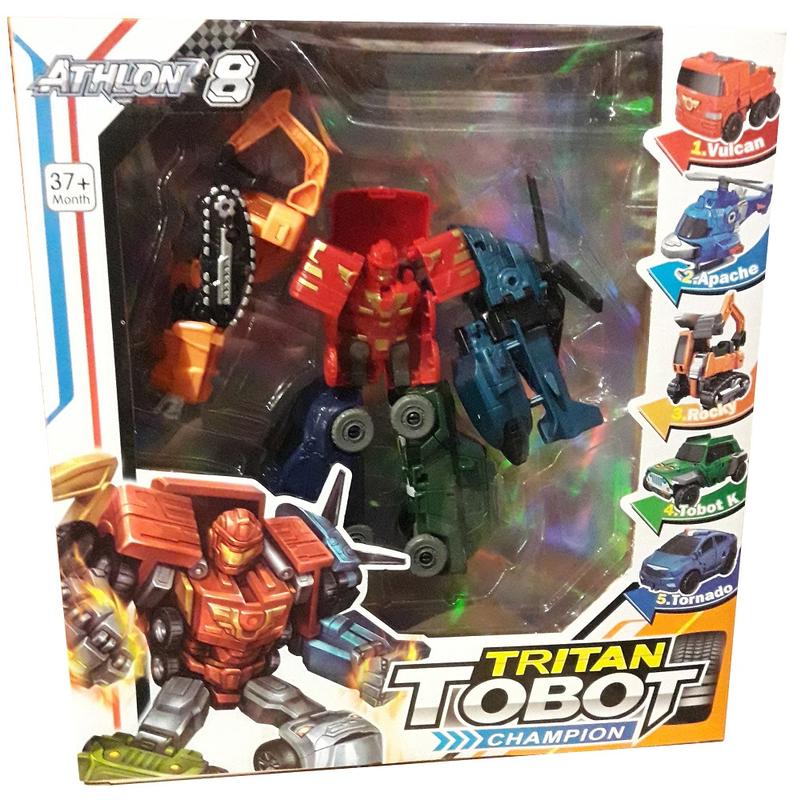 Трансформер Тобот Tritan трансформируется в 5 разных транспортных средства. Всего за несколько шагов Тобот Rocky экскаватор и Тобот Apache вертолет трансформируется в правую и левую руки, Тобот K джип и Тобот Tornado полицейская машина ноги робота, а Тобот Vulcan пожарная машина становится туловищем робота. У робота подвижные руки и ноги. Размер коробки 25 * 10 * 26 см.