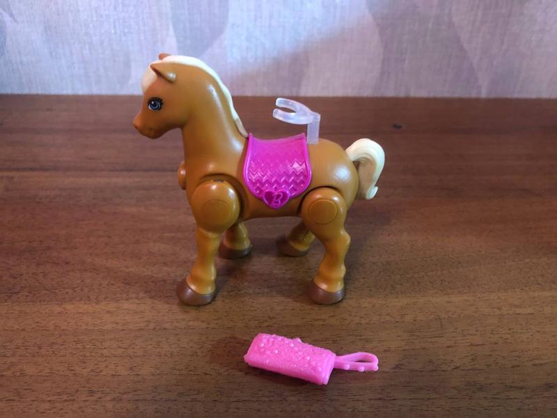 лошадка Барби Barbie с креплением для малышки Барби и с сумочкой, при нажатии кнопки ходит, утеряна одна крышечка с сустава, смотрите фото высота 9 см, длина 9 см, работает от 1 мини пальчик. батареи ААА
