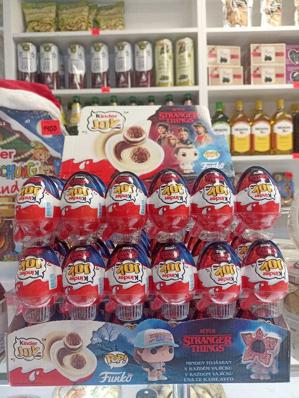 Самая ожидаемая коллекция этого года! 💸 Цена: 130 грн за 1 шт (продаж от 5 шт) Kinder Joy Funko Pop Stranger Things - это лимитированное шоколадное яйцо-сюрприз, которое сочетает любимый десерт Kinder и коллекционные фигурки по мотивам культового сериала «Очень странные дела». Яркое оформление с надписью «ВВЕРХ ПОГАМИ» сразу отсылает к мистической атмосфере Хокинса и мира Изнаночную, делая этот выпуск особенно желанным для любителей сериала и коллекционеров необычных лимиток. Особенности шоколадного яйца Kinder Joy Stranger Things Уникальность этой серии заключается не только в необычном дизайне, но и в содержимом. Шоколадное яйцо Киндер Джой традиционно состоит из двух половинок: одна сохраняет десерт, другая - игрушку-сюрприз. В лимитированной серии поклонников ждет настоящий подарок. Среди ключевых особенностей: эксклюзивная коллекция из 24 фигурок Funko Pop, созданных по мотивам сериала «Очень странные дела»; возможность найти любимых героев – Одиннадцать, Майка, Стива, Дастина, а также самого Демогоргона; дополнение для гаджетов, которые делают коллекцию еще более интересной; классический десерт Kinder Joy - нежный молочный и какао-крем с хрустящими вафельными шариками с какао-крыхтой; формат «2 в 1»: наслаждение и игрушка, которые остаются свежими благодаря уникальной упаковке Kinder. Каждое яйцо – это не просто наслаждение, а часть целой истории, где вкус и коллекционирование переплетаются в одном сюрпризе.