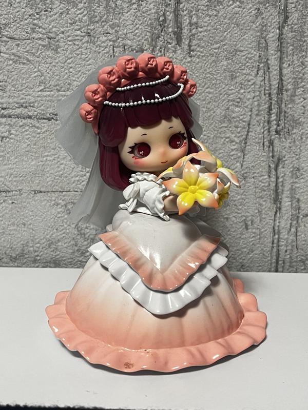 Серед далеких світів, де кольори сяють м’якіше за вранішній туман, живуть маленькі істоти Ziyuli. Кожна з них – мов краплинка мрії: великі блискучі очі, ніжні риси обличчя й аксесуари, що нагадують про дитячі сни. Колекційна фігурка має напівпрозорий елемент у вигляді фати, яка вкрита блискітками. Героїня сидить, тримаючи букет із лілій в своїх мініатюрних ручках, на камʼяній лавці в біло-кораловій ніжній весільній сукні, придивившись до якої також можна помітити дрібні блискітки. Витончені деталі та блискучі акценти створюють фантазійну атмосферу. Фігурка в ідеальному стані, без коробки.