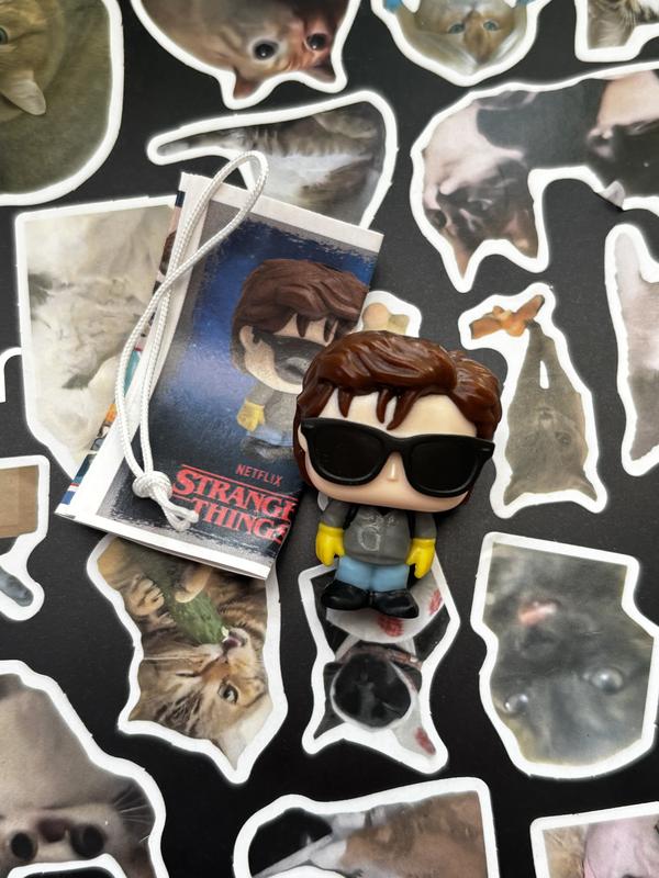 Фігурка Стіва Гаррінгтона з серіалу «Дивні дива» (Stranger Things) Культовий Стів у впізнаваному образі: сонцезахисні окуляри, фірмова зачіска та яскраві рукавички. Стиль Funko-style робить фігурку милою, але з характером — справжній «нянь Гокінса» Чудово підійде для колекціонерів, фанатів серіалу або як оригінальний подарунок. Стан хороший, виглядає стильно на полиці чи робочому столі.
