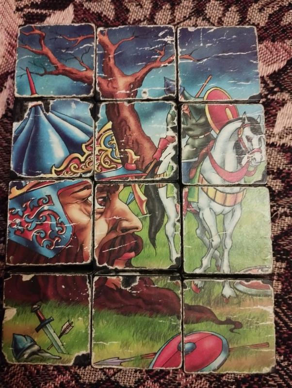 Весь зовнішній стан видно на фото. Всі малюнки які можна скласти на фотографіях. В наборі 12 кубиків. Ціна знижена бо трошки потерлися. Пересилаю. Інгулець.