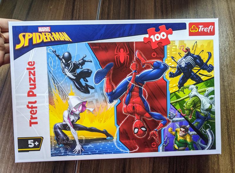 Классный яркий пазл человек паук и другие герои. На 100 элементов. После складывания получается картинка размером 41*28 см. Новый!