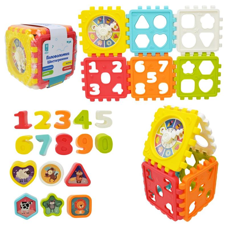 Логическая игра-сортер "Голловоломка Шестигранник" - это развивающая игрушка с множеством функций. Грани содержат отверстия в виде геометрических фигур и цифр для сортировки, а также циферблат на одной из сторон, что позволяет изучать время. Отличный выбор для развития моторики, логики и первых знаний о числах и времени!