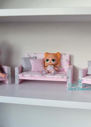 Лялькові меблі ручної роботи. В комплект входять: диван, два крісла, подушки. Розмір дивана - 14*6 см, висота 6 см Розмір крісла - 8*6 см, висота 6 см Підходить для ляльок Lol, Enchantimals . На замовлення кольори можна інші. Товар под заказ