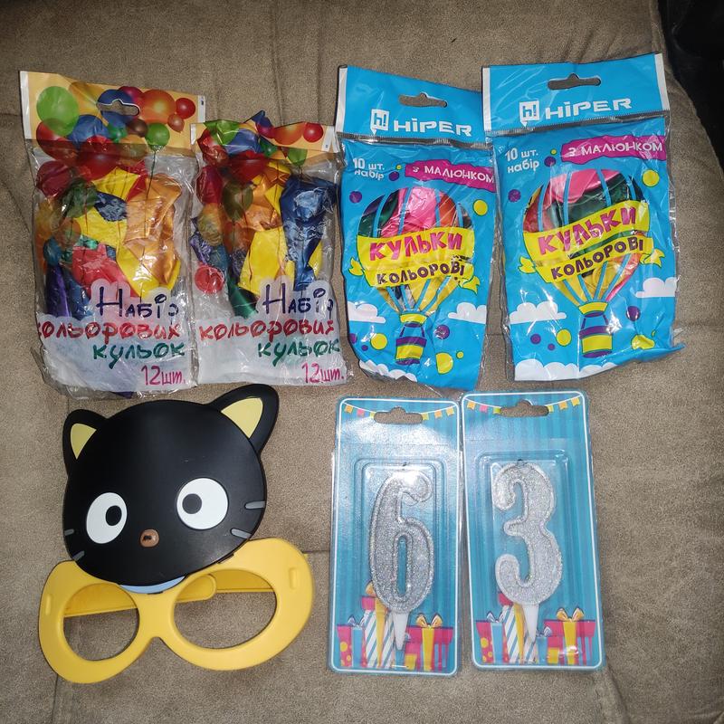 Очки 3 котик.шарики 44 штуки новые (2 набора с рисунком,2 набора без рисунка).отдам,если нужны свечки немного бу 3 и 6..Цена за все состояние хорошее.смотрите другие мои объявления.