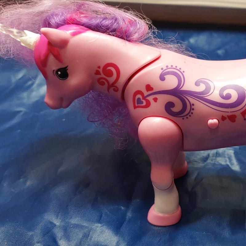 Оригінал Moose Вік від 5-ти років Розмір єдинорога 15см*12см Єдиноріг може багато що, якщо натиснути на спину, то побіжить галопом ( чомусь переставояє промто ноги на місці), а натиснути на малюнок серця, почне танцювати, якщо піднести до рота єдинорога кексик ( загубили), він почне видавати звуки задоволення.