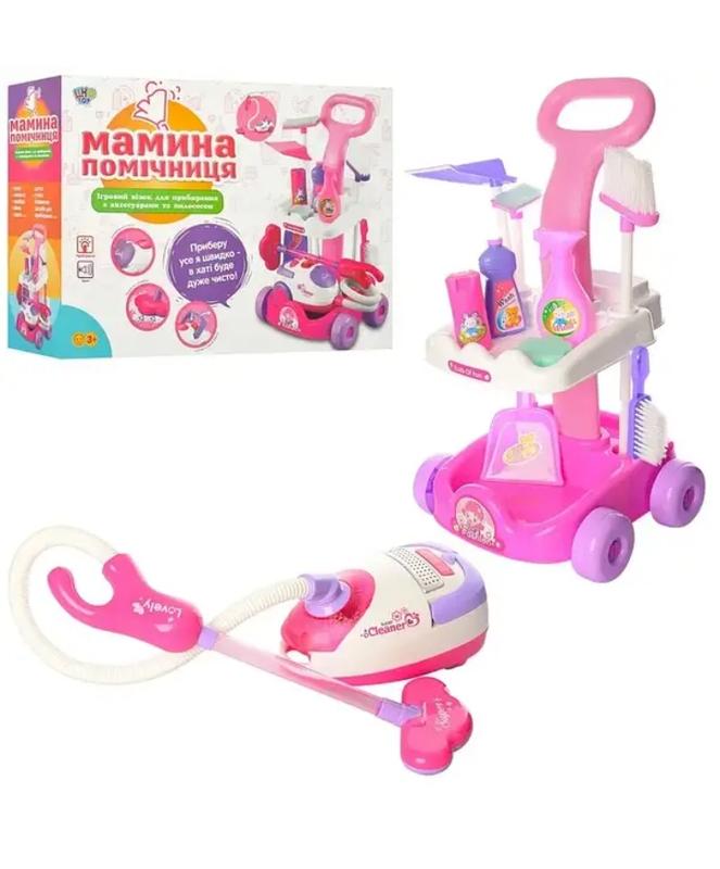 Набор для уборки с пылесосом арт. 5938 В наборе тележка, пылесос, швабра, щетки, совок. Пылесос работает от батареек, со световыми эффектами. Размер упаковки: 49-36-15,5 см