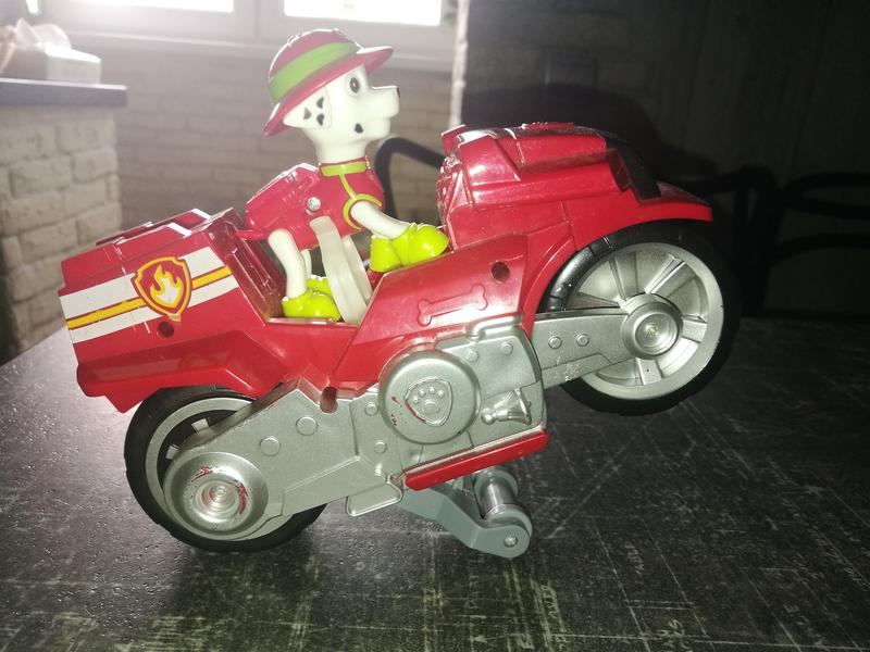 Маршал на мотоцикле. Качественный пластик. Щенок надёжно крепится на мотоцикле, легко вынимается от туда. Все части щенка подвижные. Отличный подарок для фанатов мультика. Есть мелкие потертости. На общий вид и функционал не влияет. Не маленький, (фото со спичечной коробкой)