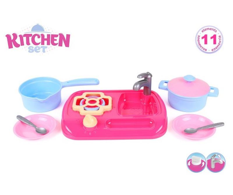 У новій кухні є все саме необхідне для маленьких кухарів. На поверхні з газовою конфоркою можна приготувати смачні страви для іграшкових друзів. Для цього у наборі є велика каструля з кришкою, сотейник, тарілки, ложки та виделки.А після святкового обіду треба помити посуд. Це можна зробити у іграшковій мийці з краном та рухомою ручкою. Іграшкова кухня з набором посуду – є чудовим подарунком для всіх малюків. З такою іграшкою маленькі кухарі можуть гратися на справжній кухні та допомагати мамі. Такі ігри добре розвивають моторику, дитячу уяву та привчають буди охайними.Набір продається у яскравій коробці з ручкою, за яку його зручно переносити.У наборі: стільниця кухонна, кран, каструля, сотейник, кришка, ложки, виделки та тарілки по 2 шт. Іграшка для дітей від 3-ох років.