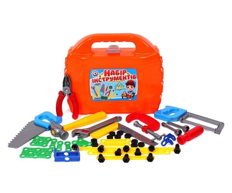 Іграшка доповнює класичний набір інструментів з набору арт. 4371 (молоток, пилочки, викрутки, плоскогубці та ін.) елементами конструктора, а саме: пластикові планки, кутники, пластини, болти та гайки. Це чудова нагода для малюка вивчити принципи роботи різьбових з`єднань, що безумовно стане в нагоді у дорослому житті. В комплекті: плоскогубці, кутник, молоток, пилка по металу, пилка по дереву, струбцина, розвідний ключ, викрутка з двома насадками, болти та гайки по 10 шт., планки - 10 шт., пластини - 10 шт., кутники - 2 шт. та 2-і скоби.
