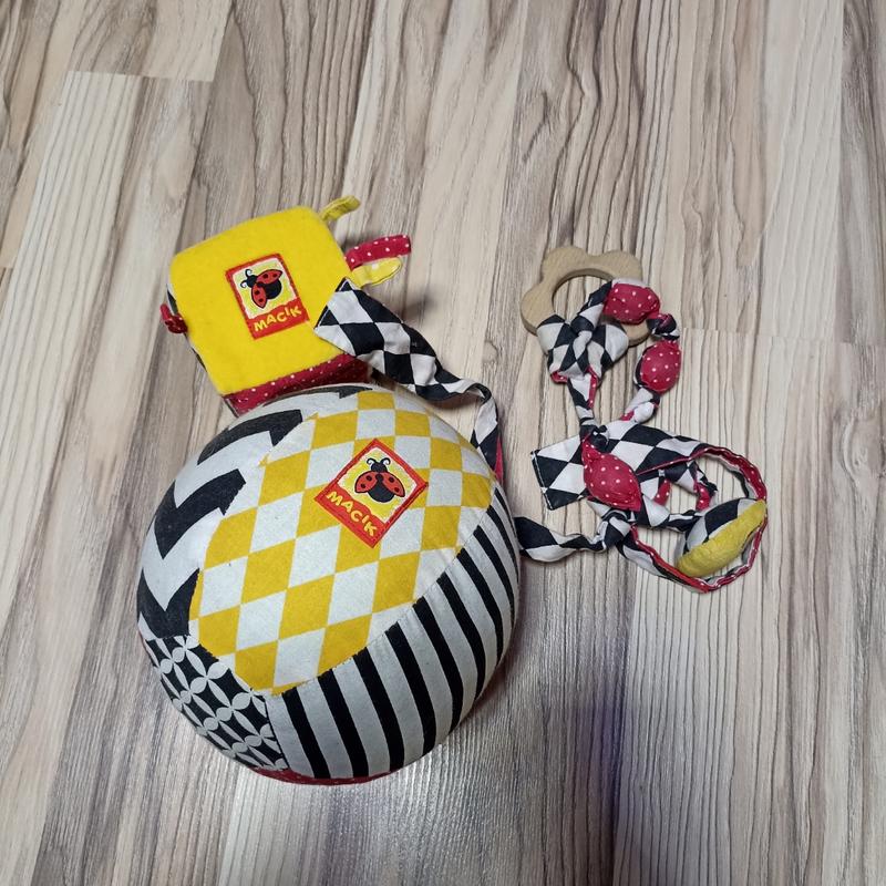 Развивает навыки: мелкая моторика, сенсорика, слух Особенности: кубик гремит и шуршит, мячик звенит На месте материал - дерево