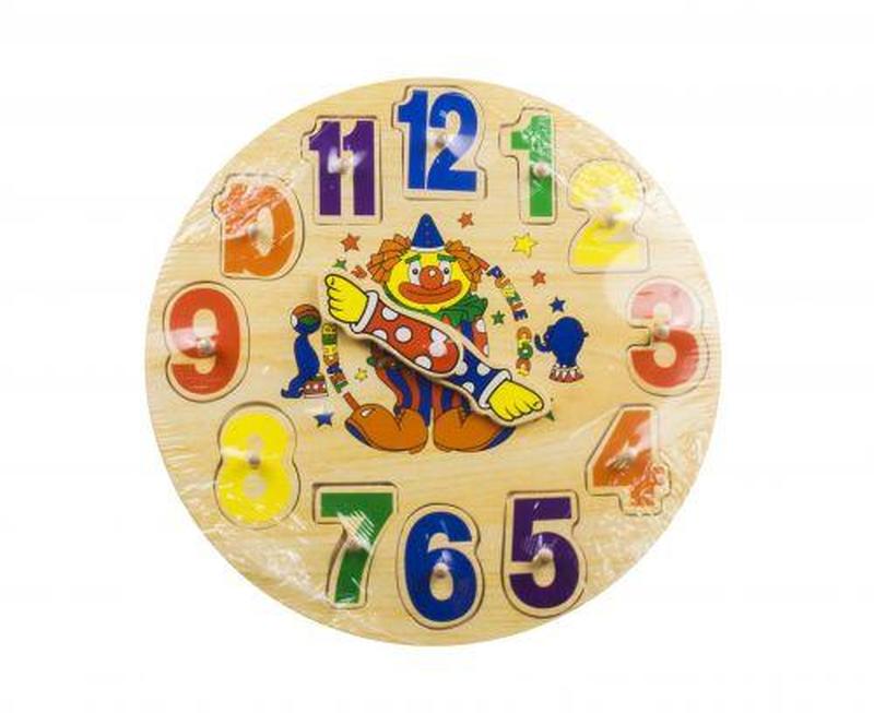 Деревянная игрушка "Часы". Служат для обучения детей времени. Кроме того, могут использоватся как сортер (12 вкладышей разной формы).