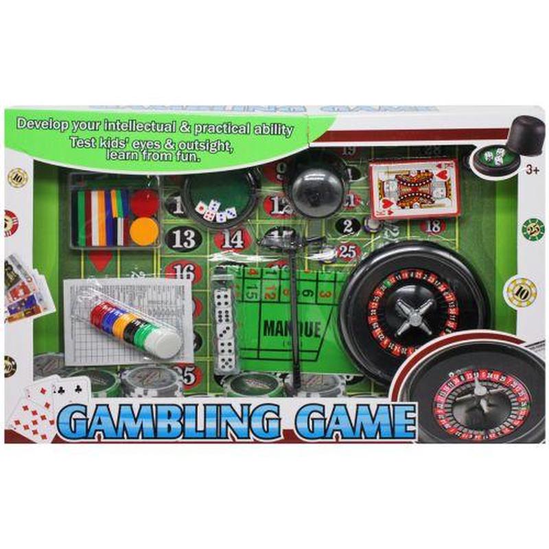 Большой игровой набор - мини версия настоящего казино. В набор входит рулетка, кубики (маленькие и большие), чашечка для кубиков, лопатка, фишки и игральные карты. На упаковке изображено игровое поле, которое можно вырезать и использовать в игре.