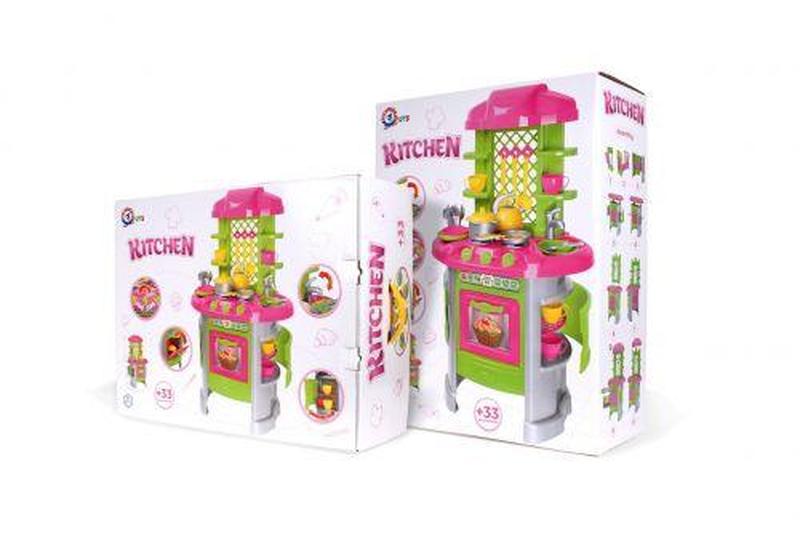 Кухня 8 ТехноК. В комплект входит сковородка, кастрюля, глубокие тарелки, чашки, столовые и кухонные приборы и чайник. Крышка духовки открывается и в неё можно положить посуду. В боковых стенках - два шкафчика с полочками для хранения посуды. Ширина кухни 24 см.