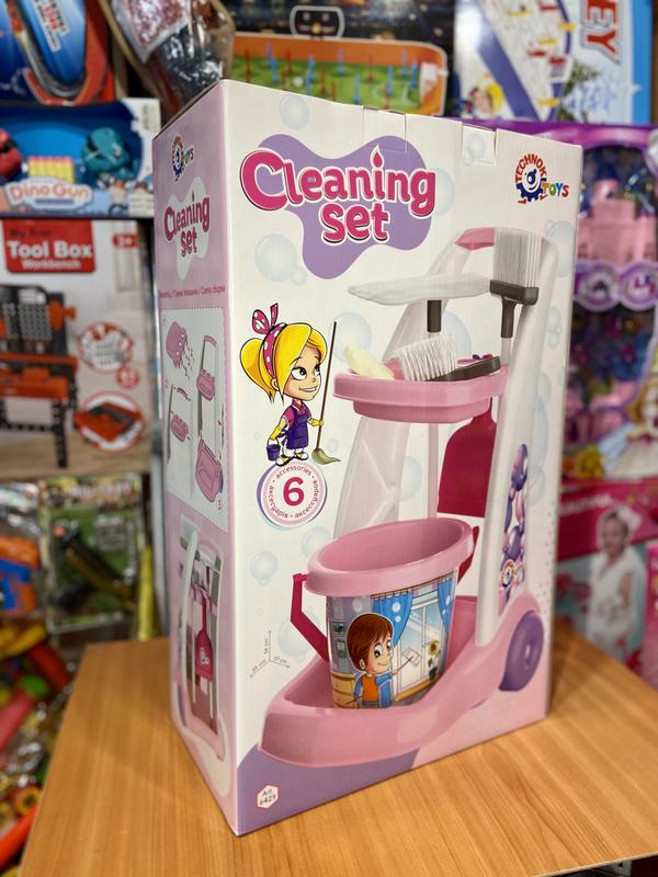 В «Наборе для уборки ТехноК» есть яркое ведерко с красочной наклейкой, выполненной с помощью технологии IML, швабра, метла, щеточка и совок. Все элементы можно разместить на возику и перевозить с собой. На нижней полке тележки есть специальное место для ведерка, а на верхней полке с тремя крючками удобно разместить мелкие элементы набора. С таким возиком все необходимое всегда будет под рукой. Тележкой можно пользоваться как дома, так и на игровой площадке. А как использовать тележку на улице малыш с друзьями решит сам, ведь перевезти на этой коляске можно много. Игрушечный набор станет любимой игрушкой для маленьких помощниц, ведь можно все делать «как мама». Убирать в кукольной комнате или ухаживать за домашними любимцами. Такие игры помогают развивать воображение, мышление и память, знакомят малышей с различными профессиями, учат опрятности. Упаковка – яркая коробка37.5х20х61,8 см