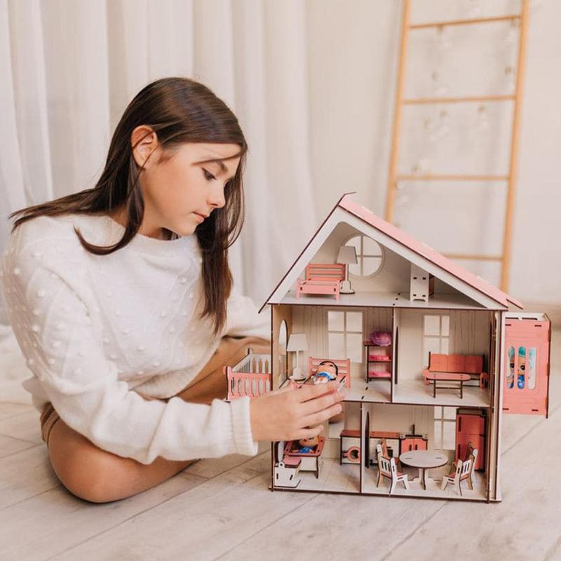 Дерев'яні будиночки для ляльок ЛОЛ – це безпечні та естетичні іграшки. Будиночки виготовлені з якісних матеріалів, які пройшли ретельну обробку. Кожен елемент іграшки відповідає високим стандартам безпеки.Будиночки виготовлені з ХДФ та фанери, міцного та довговічного матеріалу. Дерево правильно оброблене, не виділяє шкідливих речовин, покрите безпечними фарбами, які не викликають алергічні реакції у дітей та дорослих.Готові вироби досить легкі, але стійкі, прослужать багато років, збережуться у гарному стані. Конструкції продумані до дрібниць, просто й швидко збираються без інструментів та зусиль. Будиночки призначені для ляльок ЛОЛ, а також можуть використовуватись для інших іграшок.Залежно від моделі будинок може мати три, чотири або п'ять кімнат. Кожен має меблі: ліжко, стіл та стільці, кухонні меблі, техніка та інші. У деякі комплекти входить гараж для іграшкових авто.Розімри:-Висота 46,5см;-Ширина 37,4см;-Глибина 16см;-Висота поверху - 15,5см;-У розібраному вигляді габарити 39х35х8см.Набір меблів для маленьких ляльок (ДхШхВ):-Журнальний столик - 7х4х4см - 1шт;-Крісло-гойдалка - 7х4х6см - 2шт;-Стіл кухонний - 9х9х4см - 1шт;-Стілець кухонний зі спинкою - 3х4х6см - 4шт;-Холодильник двокамерний на 4 відділення - 4,7х3,2х10см; - 1шт;-Плита для приготування їжі - 5,1х3х5,1см - 1шт;-Мийка - 5,3х3х5,3см - 1шт;-Торшер - 4х4х8,5см - 2шт;-Ліжко - 9х6х5см - 2шт;-Полиці для книг та іграшок - 5,5х3х6,7см - 2шт;-Ванна 10х6х4см - 1шт;-Унітаз 3,7х4х7см - 1шт.ХДФ або HDF (High Density Fiberboard) - це інноваційний матеріал, деревоволокниста плита дуже високої щільності. Для її виробництва використовуються тільки екологічно чиста деревина, без фенолформальдегідних смол та інших шідлививх домішок. Тому по екологічності цей матеріал можна порівнювати з натуральним деревом.Будиночок відправляється в розібраному стані.